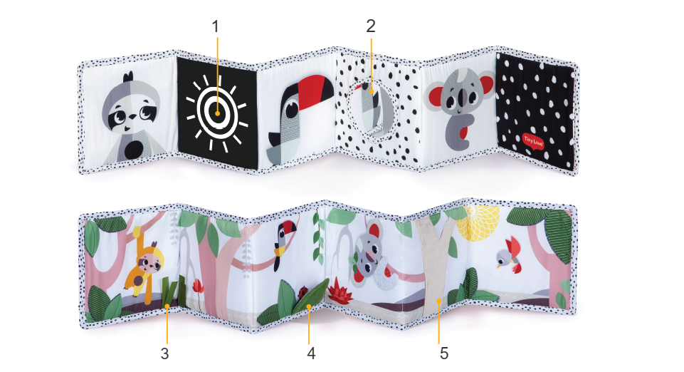 Чорно-біла сторона пропонує дитині необхідну зорову стимуляцію з першого дня життя. Покладіть книжку на зручній відстані від дитини і дозвольте їй спробувати сфокусувати погляд на контрастних формах і дзеркалі.